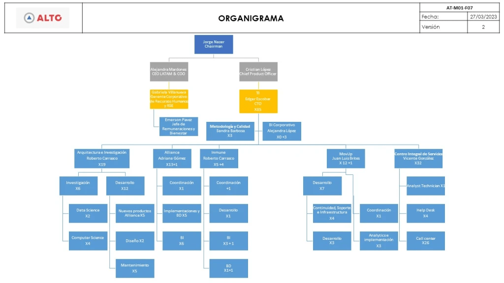 - Help Desk, is responsible for providing Alto’s employees with a single point of contact through which their needs related to the use of resources and services of technological platforms are resolved and/or channeled, always according to a standard adopted by the company.