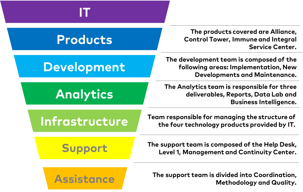 The IT team is divided into different areas that cover the technological operation of the company, as shown in the following chart.